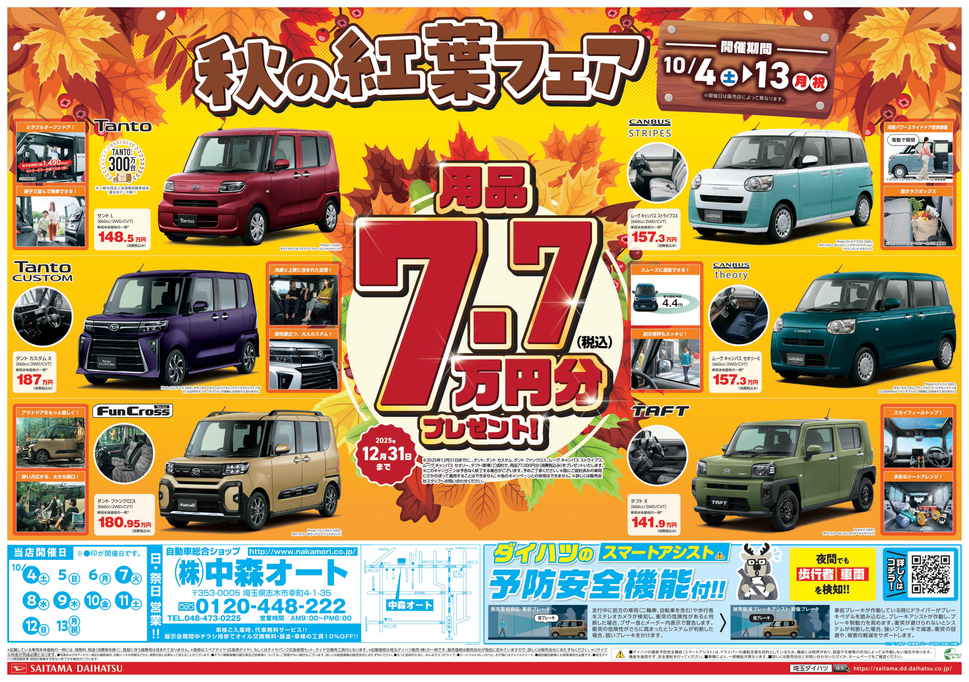2025.09.24 営業日カレンダー掲載 2025.10.03 NEW秋の紅葉フェア 10月4日(土)~13日(月・祝) 2025.08.04 夏の大感謝祭フェア 8月2日(土)~10日(日) お知らせ一覧 車検・整備 ていねいな中森オートの車検。当店はスピード車検ではありませんが、次の法定点検までしっかりと乗れる仕事をしております。 鈑金・塗装 カーリフォーム専門工場での一貫作業で修理するので、早い・安い・きれい。ネットで見積もりも可能です! 新車販売 メーカーを問わず販売しています!新しい新車の乗り方「コアラクラブ」なら頭金0円・定額支払いで新車に乗れます。 中古車販売 一般社団法人日本中古自動車販売協会連合会が認定する、安心と信頼の「JU適正販売店」です。全車ドライブレコーダーをプレゼント中です! 買い取り 高価買取→自社整備→直販だから高く買います!ネットでご注文予約可能です! オークション代行 多くのオートオークション会場正規加盟店なので欲しい車がきっと見つかります。 中古車情報 JUジャナイトで在庫を見る チラシ 秋の紅葉フェア 10月4日(土)~13日(月・祝) 「秋の紅葉フェア 10月4日(土)~13日(月・祝)」の詳細を見る 整備士・鈑金塗装工 急募!! 「整備士・鈑金塗装工 急募!!」の詳細を見る おすすめ情報 車検整備のお客様には親切丁寧なご説明をさせていただいております! 「車検整備のお客様には親切丁寧なご説明をさせていただいております!」の詳細を見る 当社は純正部品・純正オイルを使用しております。 「当社は純正部品・純正オイルを使用しております。」の詳細を見る 各種保険の指定工場なので安心整備を約束します。 「各種保険の指定工場なので安心整備を約束します。」の詳細を見る 認定店だからやっぱり安心!! 当店はJU適正販売店です。(外部サイト) 「認定店だからやっぱり安心!! 当店はJU適正販売店です。(外部サイト)」の詳細を見る ダイハツ中古車高価買取り実施中!! 「ダイハツ中古車高価買取り実施中!!」の詳細を見る フレッシュドライバー応援企画 「フレッシュドライバー応援企画」の詳細を見る