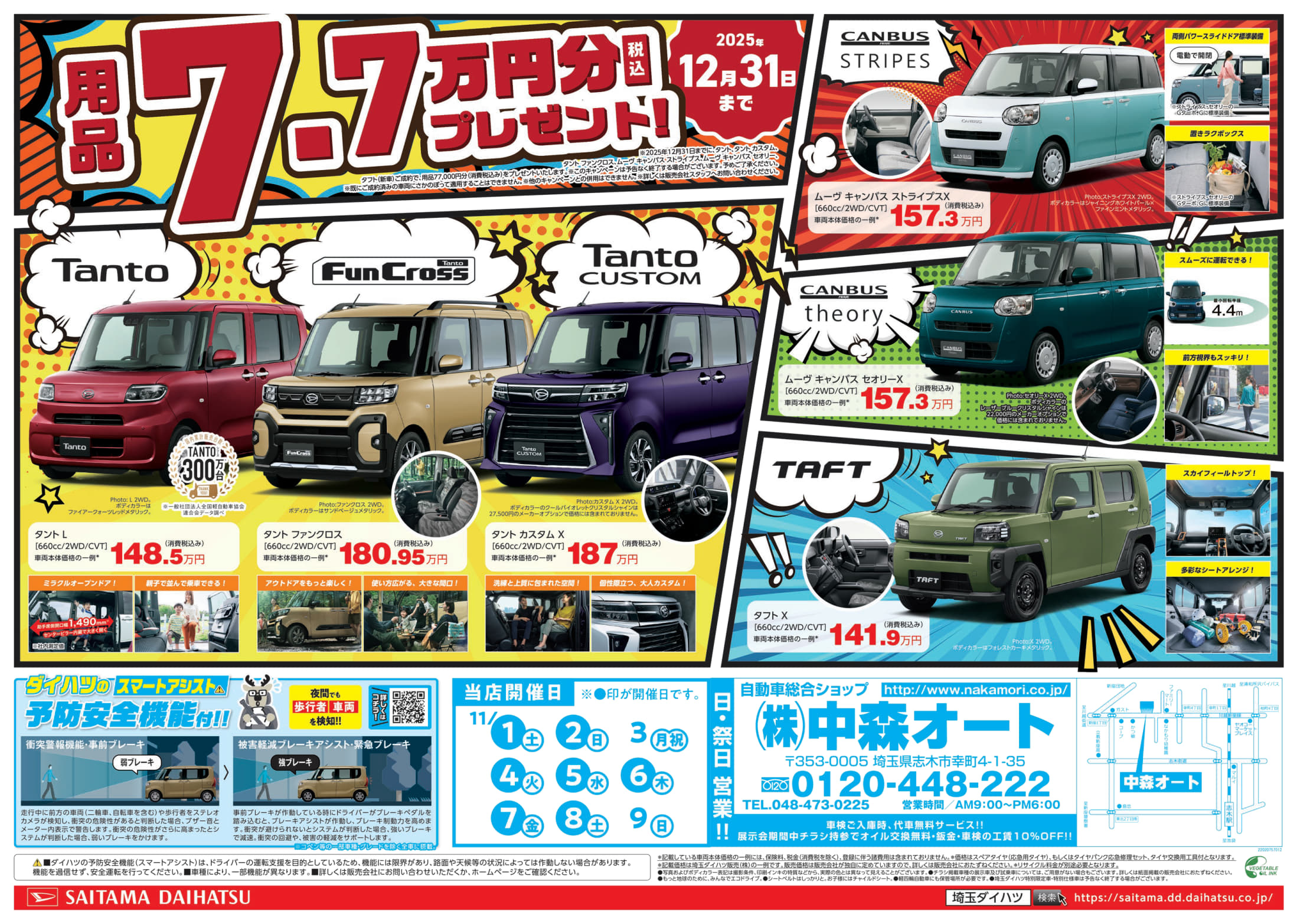 2025.09.24 営業日カレンダー掲載 2025.11.04 NEW用品7.7万円分プレゼント! 12月31日まで 2025.10.03 秋の紅葉フェア 10月4日(土)~13日(月・祝) お知らせ一覧 車検・整備 ていねいな中森オートの車検。当店はスピード車検ではありませんが、次の法定点検までしっかりと乗れる仕事をしております。 鈑金・塗装 カーリフォーム専門工場での一貫作業で修理するので、早い・安い・きれい。ネットで見積もりも可能です! 新車販売 メーカーを問わず販売しています!新しい新車の乗り方「コアラクラブ」なら頭金0円・定額支払いで新車に乗れます。 中古車販売 一般社団法人日本中古自動車販売協会連合会が認定する、安心と信頼の「JU適正販売店」です。全車ドライブレコーダーをプレゼント中です! 買い取り 高価買取→自社整備→直販だから高く買います!ネットでご注文予約可能です! オークション代行 多くのオートオークション会場正規加盟店なので欲しい車がきっと見つかります。 中古車情報 JUジャナイトで在庫を見る チラシ 用品7.7万円分プレゼント! 12月31日まで 「用品7.7万円分プレゼント! 12月31日まで」の詳細を見る 整備士・鈑金塗装工 急募!! 「整備士・鈑金塗装工 急募!!」の詳細を見る おすすめ情報 車検整備のお客様には親切丁寧なご説明をさせていただいております! 「車検整備のお客様には親切丁寧なご説明をさせていただいております!」の詳細を見る 当社は純正部品・純正オイルを使用しております。 「当社は純正部品・純正オイルを使用しております。」の詳細を見る 各種保険の指定工場なので安心整備を約束します。 「各種保険の指定工場なので安心整備を約束します。」の詳細を見る 認定店だからやっぱり安心!! 当店はJU適正販売店です。(外部サイト) 「認定店だからやっぱり安心!! 当店はJU適正販売店です。(外部サイト)」の詳細を見る ダイハツ中古車高価買取り実施中!! 「ダイハツ中古車高価買取り実施中!!」の詳細を見る フレッシュドライバー応援企画 「フレッシュドライバー応援企画」の詳細を見る