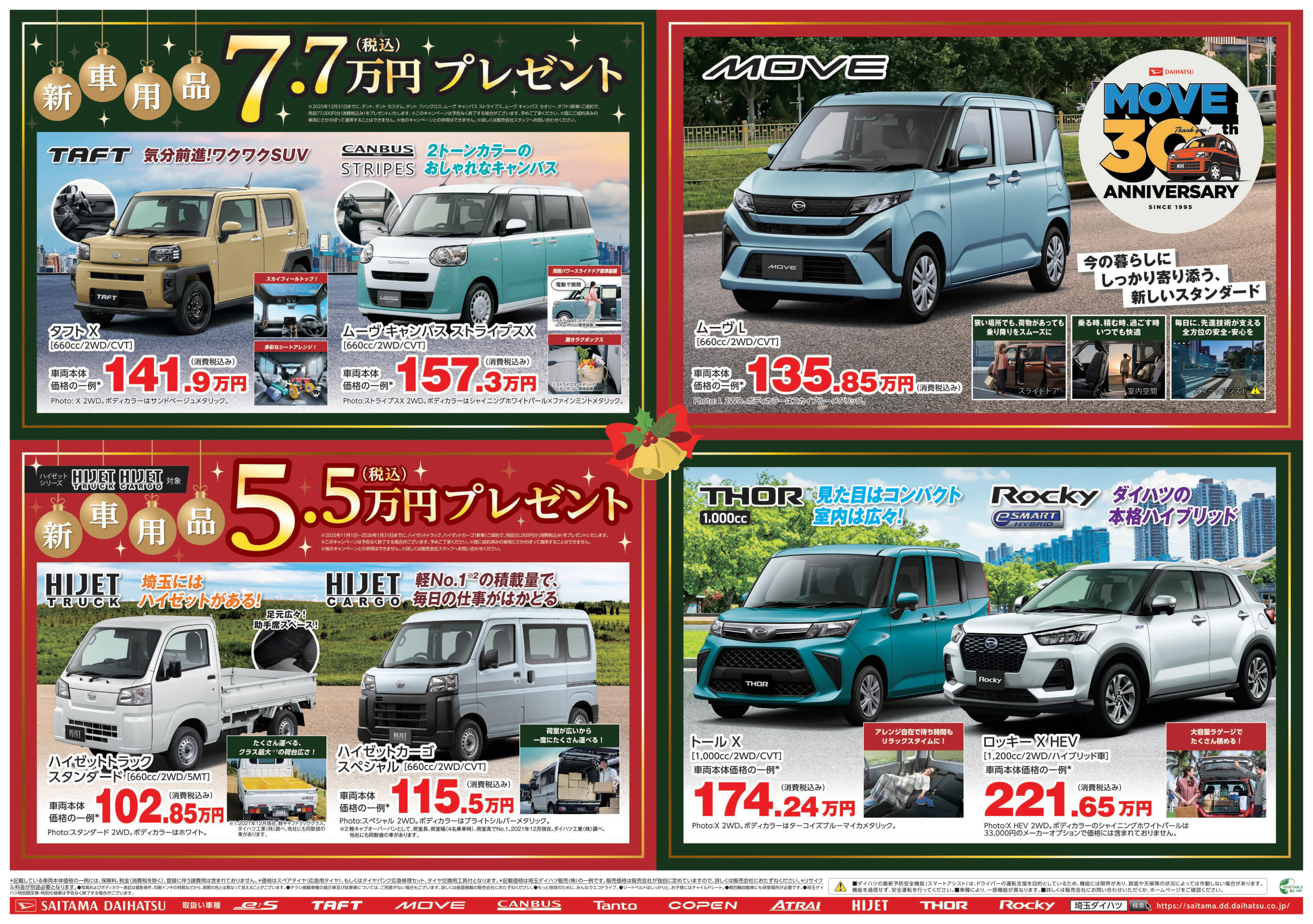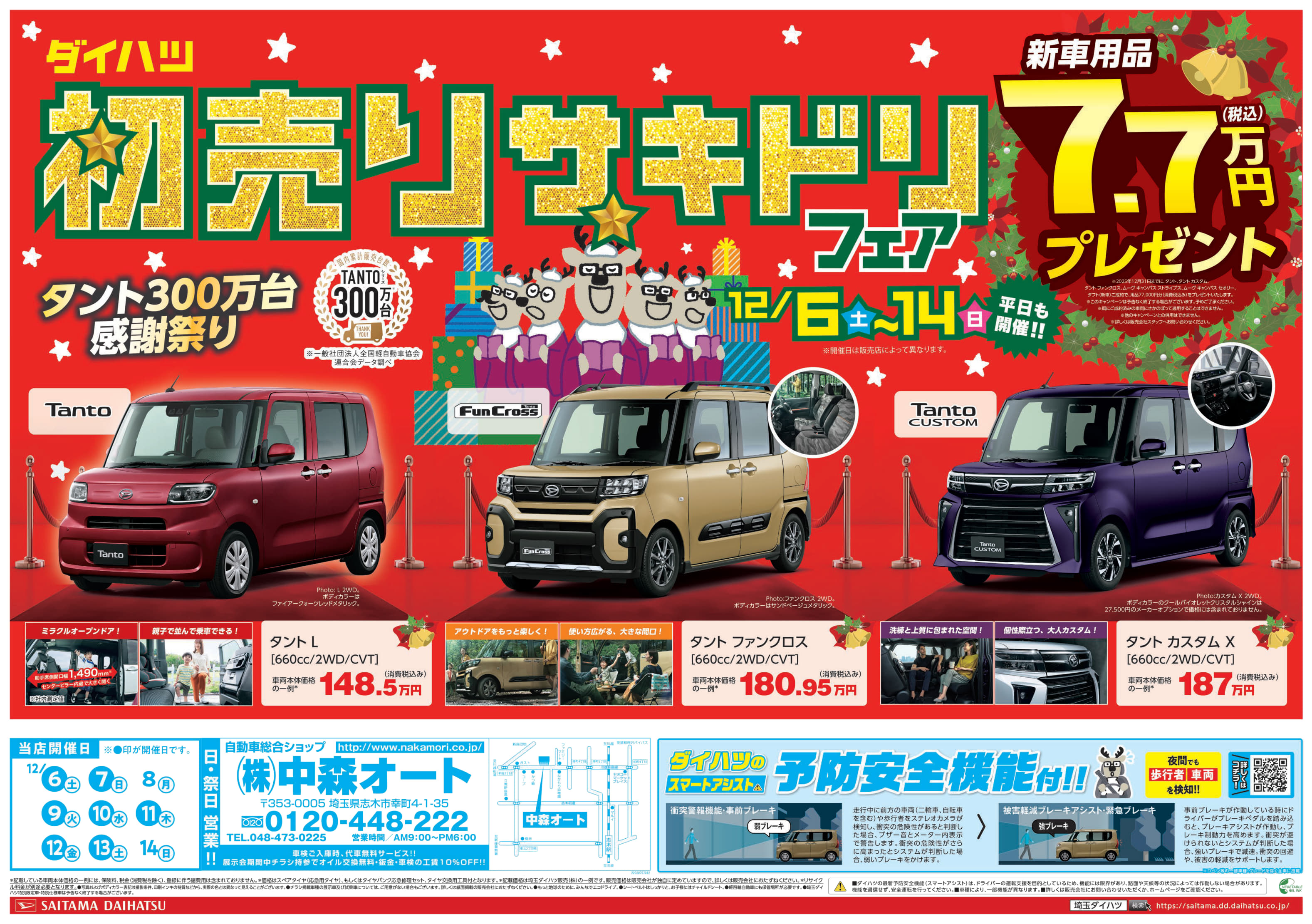 チラシ 初売りサキドリフェア 12月6日(土)~14日(日) 「初売りサキドリフェア 12月6日(土)~14日(日)」の詳細を見る 用品7.7万円分プレゼント! 12月31日まで 「用品7.7万円分プレゼント! 12月31日まで」の詳細を見る 整備士・鈑金塗装工 急募!! 「整備士・鈑金塗装工 急募!!」の詳細を見る